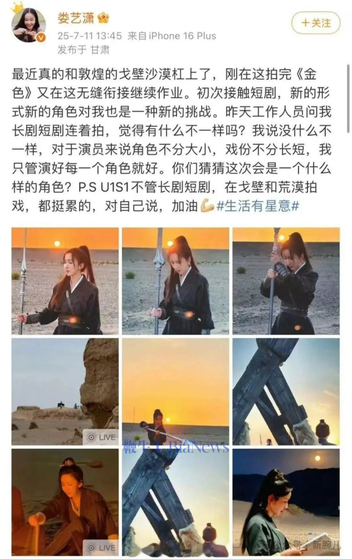 「最近真的和敦煌的戈壁沙滩杠上了,刚在这拍完《金色》又在这里无缝衔接继续作业。初次接触短剧,新的形式新的角色对我也是一种新的挑战。昨天工作人员问我长剧短剧连着拍,觉得有什么不一样吗?我说没什么不一样,对于演员来说角色不分大小,我只管演好每个角色就好。」